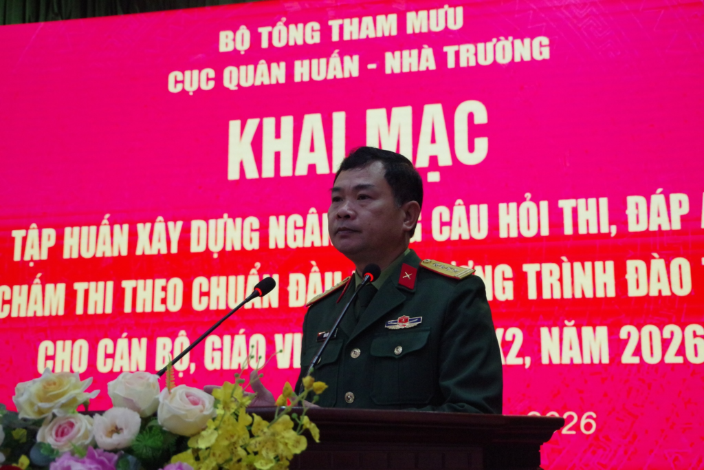 Sáng ngày 13/3/2026, tại Trường Quân sự Quân khu 2, Cục Quân huấn – Nhà trường, Bộ Tổng Tham mưu tổ chức khai mạc lớp tập huấn xây dựng ngân hàng câu hỏi thi, đáp án chấm thi theo chuẩn đầu ra chương trình đào tạo cho đội ngũ cán bộ, giáo viên Nhà trường. Dự chủ trì khai mạc có Đại tá Hán Đức Nhu, Phó Hiệu trưởng Nhà trường – Phó trưởng ban tổ chức lớp học, dự còn có đồng chí Đại tá Tiến sĩ Nguyễn Văn Thái, Trưởng phòng Khảo thí và Đảm bảo chất lượng đào tạo/Cục Quân huấn – Nhà trường/BTTM, Phó trưởng Ban Tổ chức Lớp tập huấn, Thượng tá Đinh Đăng Định, cán bộ Cục Quân huấn – Nhà trường/BTTM, ủy viên Ban Tổ chức lớp tập huấn; tham gia lớp tập huấn còn có các đồng chí trong Ban Tổ chức, báo cáo viên lớp tập huấn, chỉ huy các cơ quan, khoa, đơn vị cùng toàn thể các đồng chí học viên lớp tập huấn.
